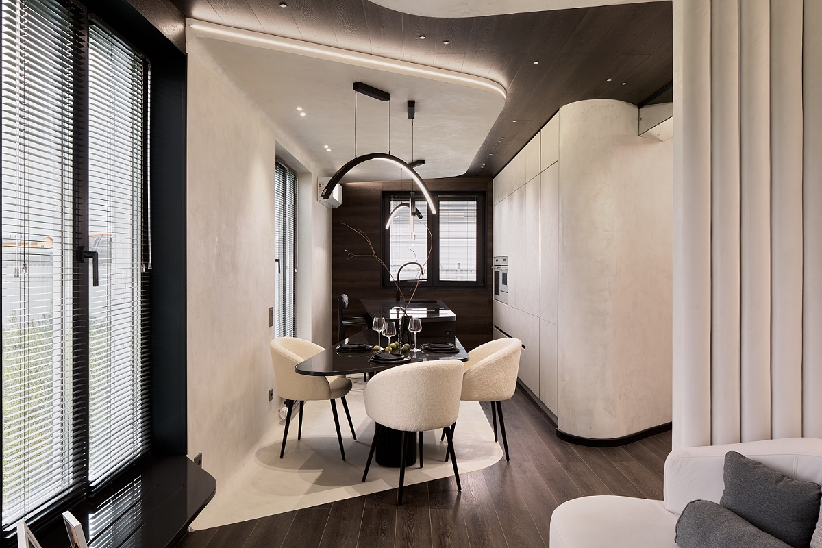 Белый кухонный гарнитур от пола до потолка, переходящий в скруглённый угол, тоже в стиле авиа. В зоне гостиной за белую самолётную часть отвечают мягкие стеновые панели. Так по-разному дизайнеры оформили пространство, учитывая, что гостиная станет более уютной, а кухня — более обтекаемой и модерновой.