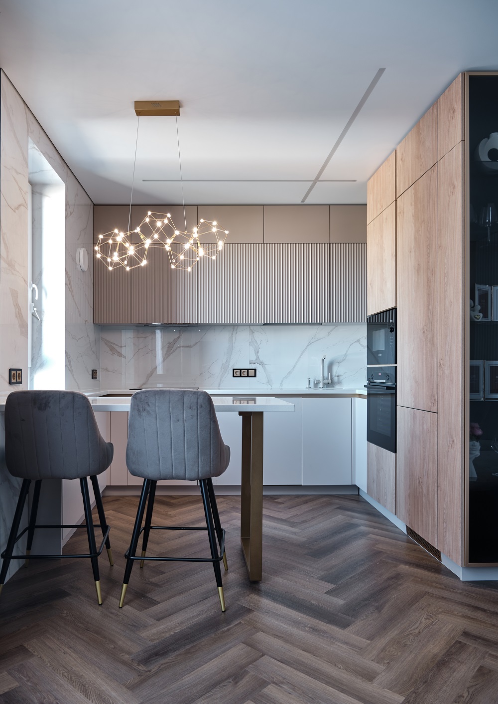 Нейтральные оттенки балансируются целым набором из текстур: ёлочка под дерево, камень, чёрное стекло, деревянные фасады, матовые ткани рисуют объем этой картины.