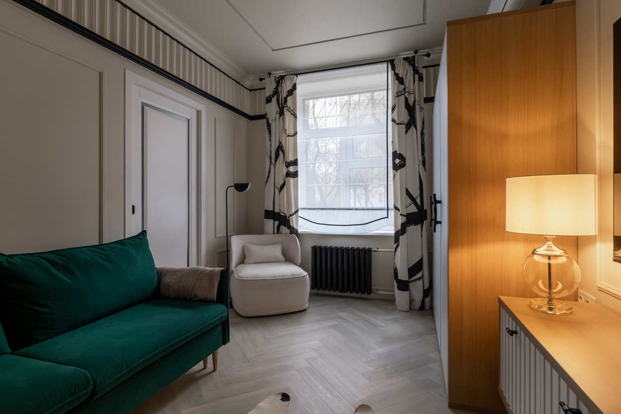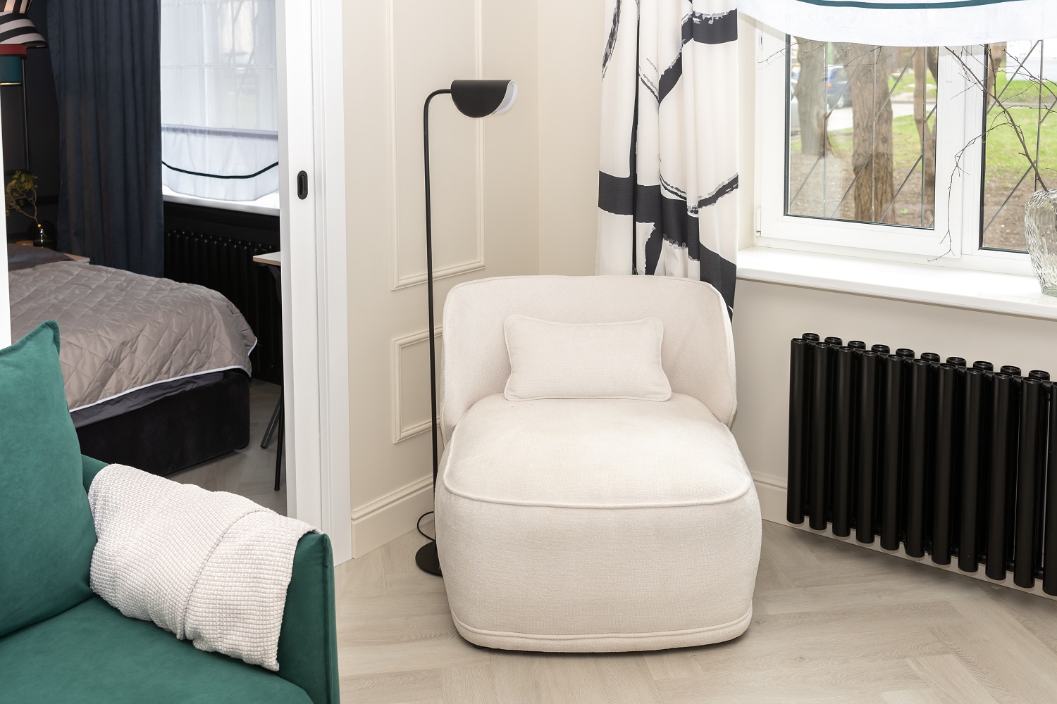 Белая гостиная с чёрной спальней